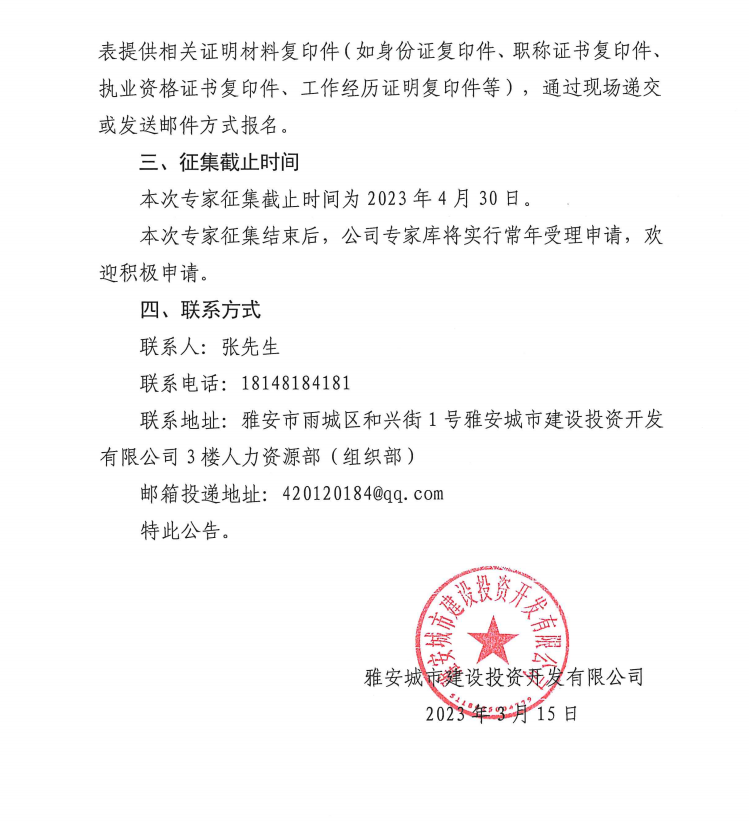 雅安城市建設(shè)投資開發(fā)有限公司關(guān)于征集入庫專家的公告