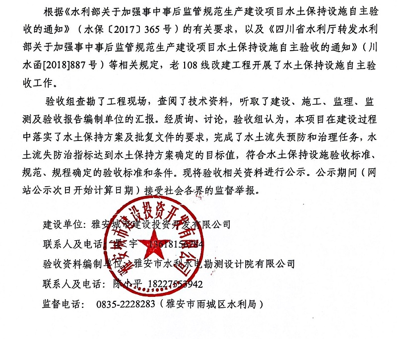 關(guān)于老108線(xiàn)改建工程水土保持設(shè)施自主驗(yàn)收情況的公示